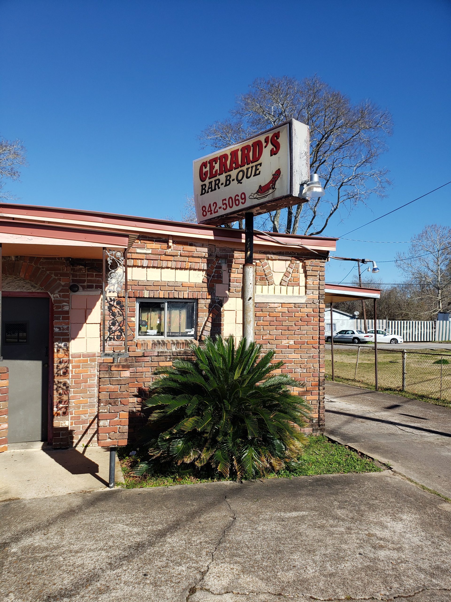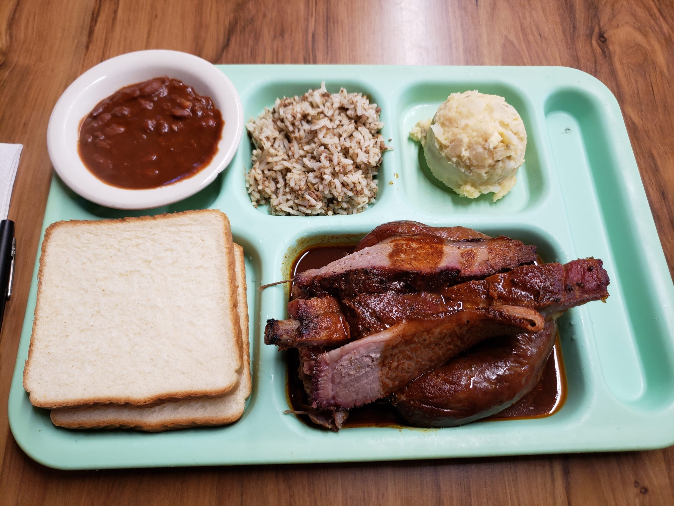 My first stop in Beaumont. I had a great time talking to George Gerard about a wide range of topics. Fortunately for me, his mom was helping out that morning, so I chatted with her as well. I ordered the beef link, sliced beef brisket, chicken, smoked pork neck bones, pork spareribs, chili beans, potato salad, and rice dressing. Of these, the beef link and the chicken were very tasty! I loved that our food was served on one of those school cafeteria trays. That sure did bring back some memories. Read a nice article on Gerard’s here.