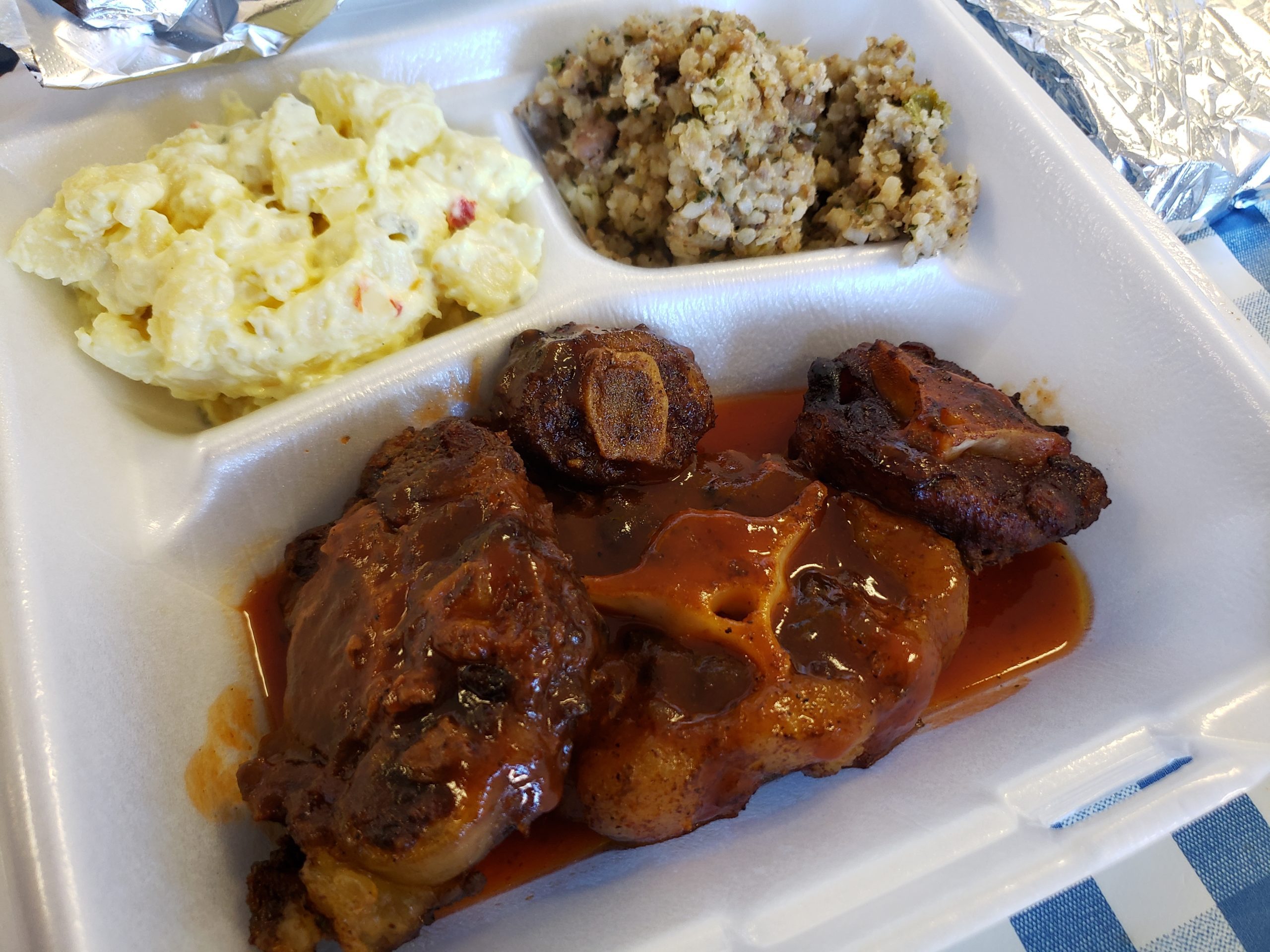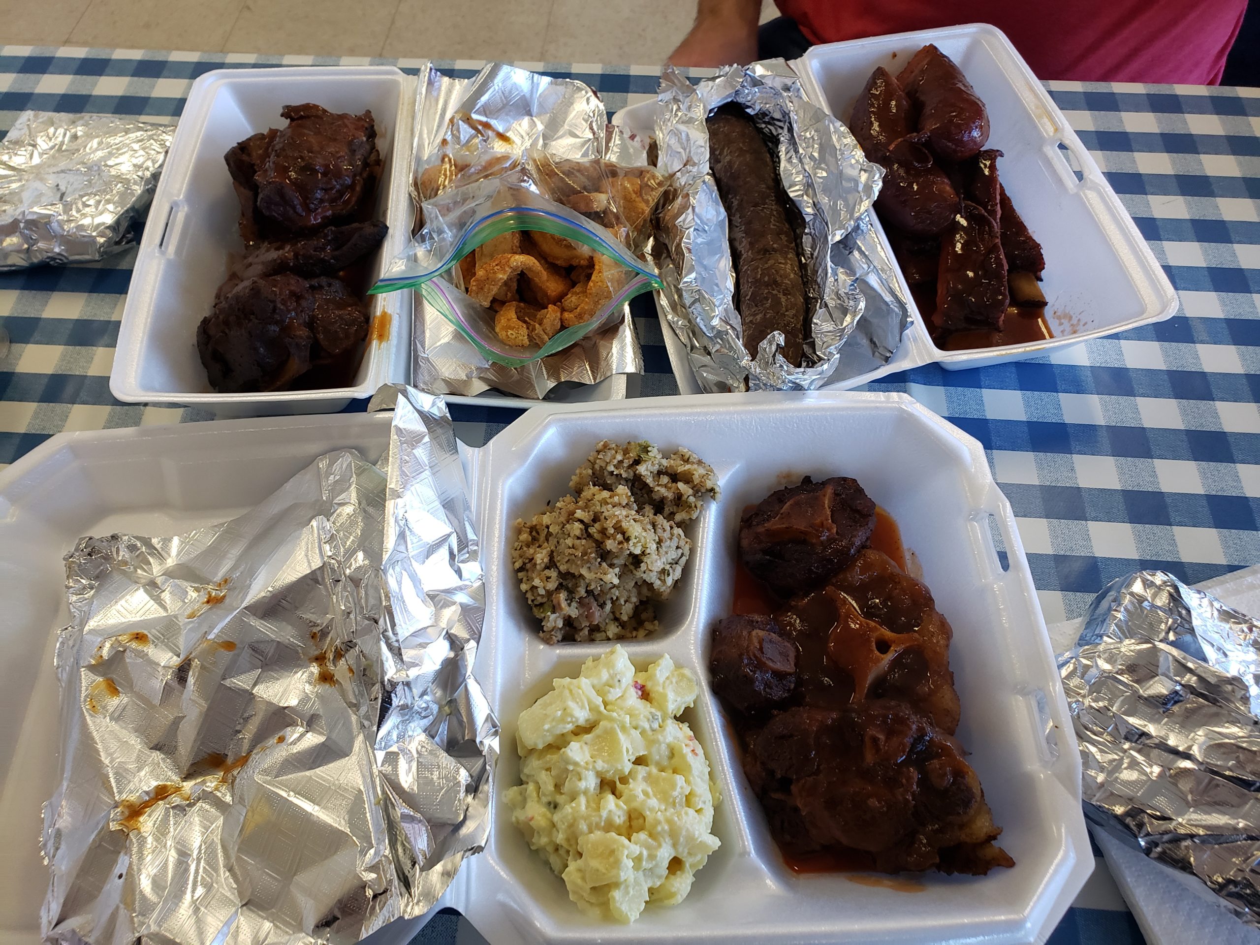 The cool thing about hanging out with a local barbecue expert is that he or she can point out places to visit that may not have been on your radar screen. Charlie’s is one of those gems. So many great and interesting things on the menu here. I ordered beef link, boudain, pork neck bones, oxtails, pork spareribs, cracklins (impressed to even see that fried, rendered pork fat would even be an option), potato salad, and rice dressing. The beef link and spareribs were very good, but the neck bones and the oxtails were next-level. Both were a little chewy, spicy, and very flavorful. Unusual for a barbecue place, but a welcome menu option. Fantastically, Charlie’s was picked as a “Best new BBQ restaurant” by Texas Monthly.
