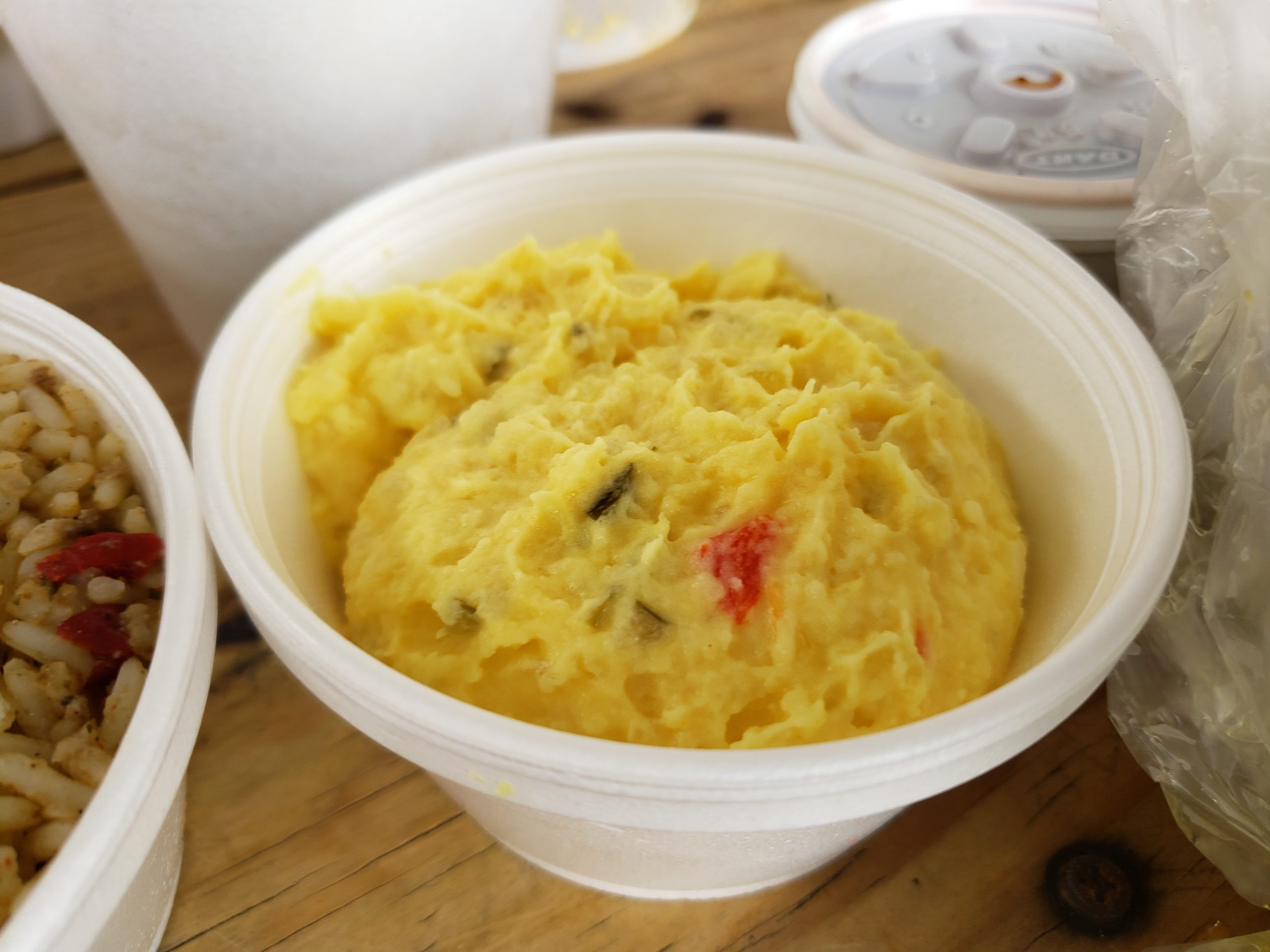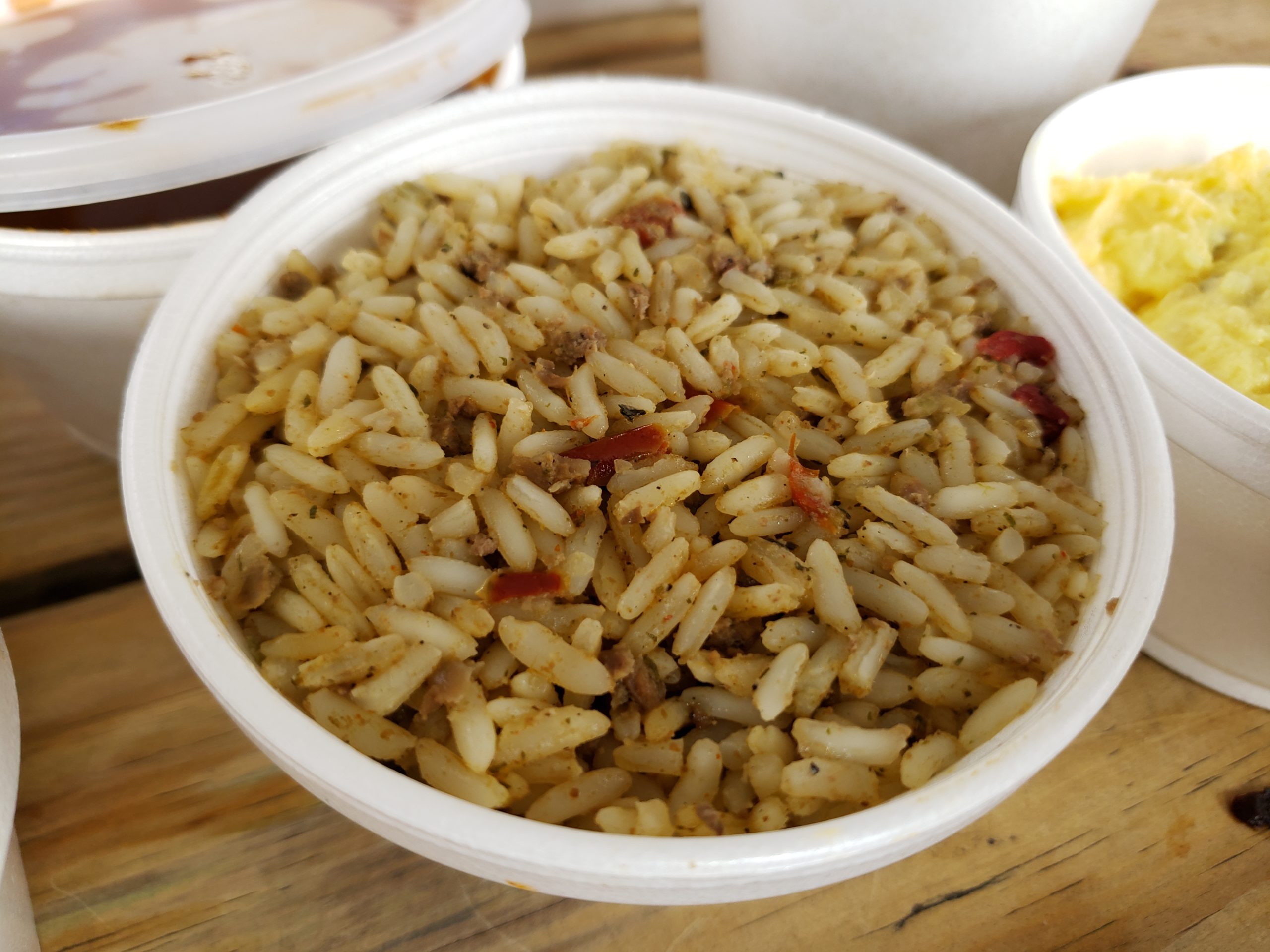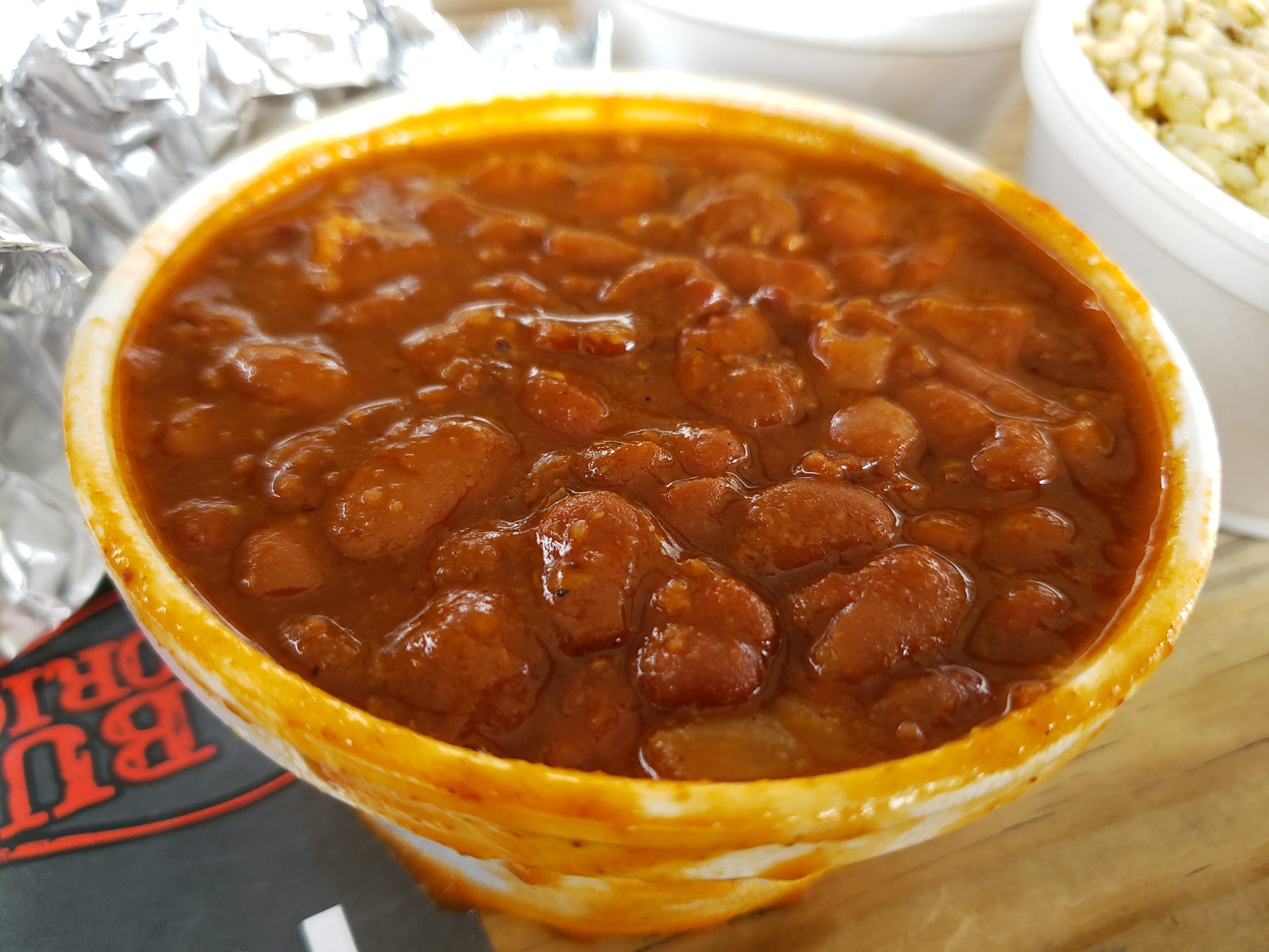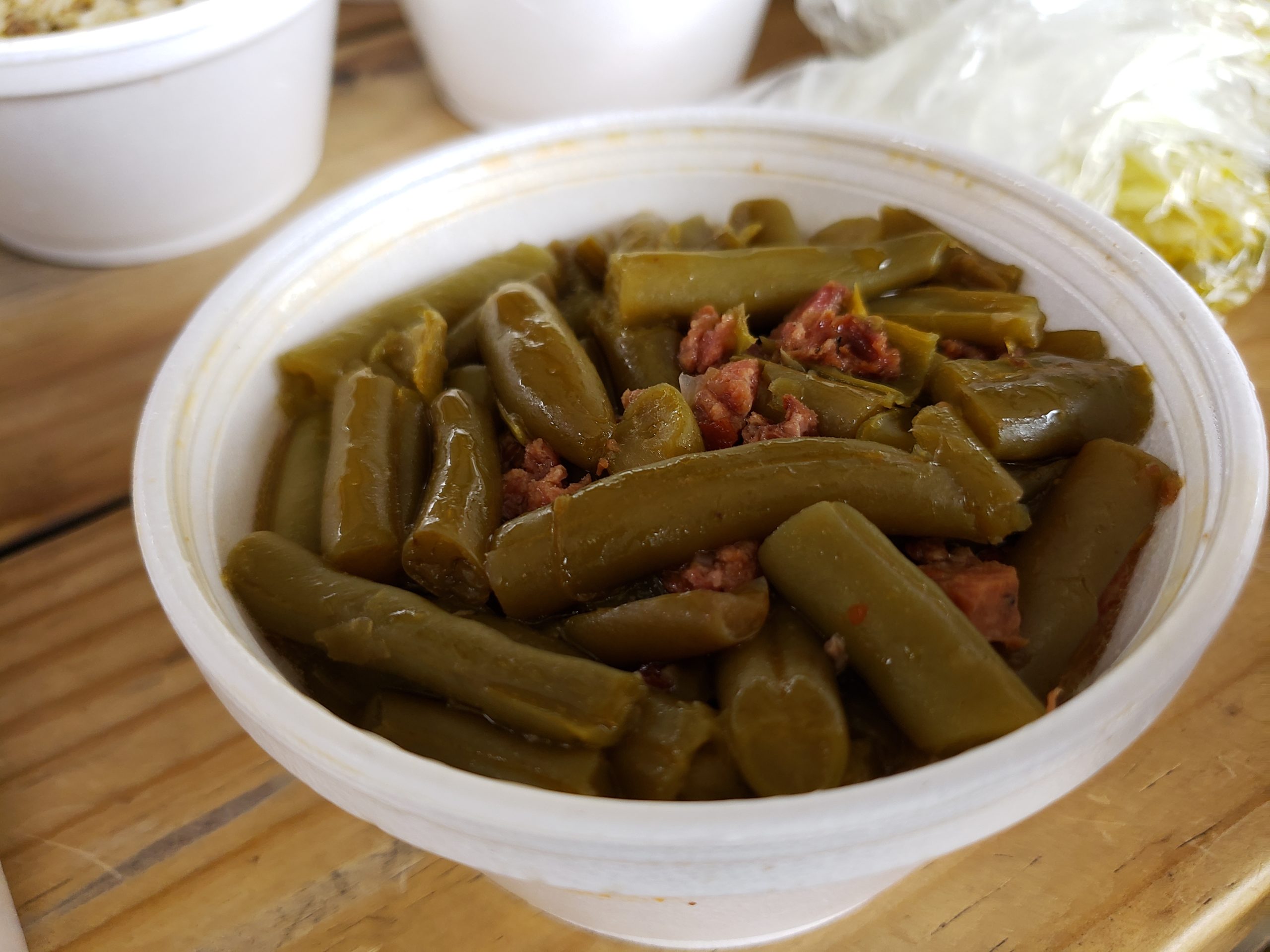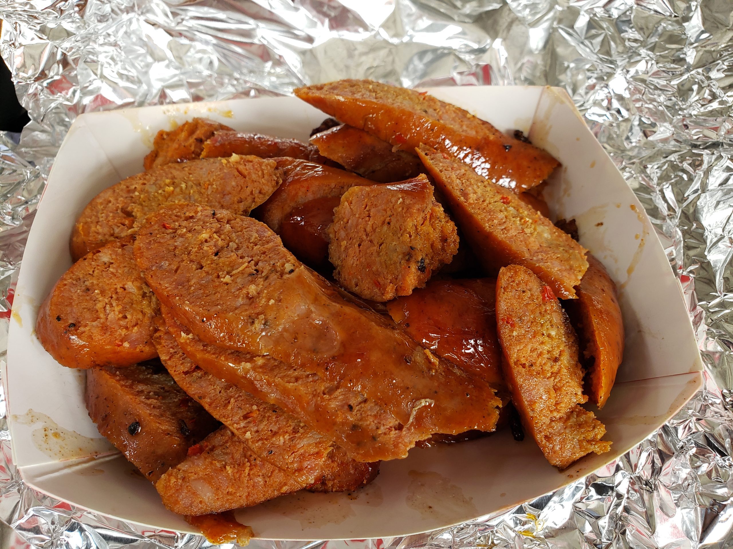 I rolled to this place and a Friday night, and I thought I was in a club. Old school funk was blaring with a group assembled on the patio, and there was a steady flow of to-go orders. I wasn’t too hungry, but fortunately some other people joined me. I ordered beef brisket, boudain (a Creole sausage made of seasoned pork and rice. It’s usually spelled “boudin.”), chicken, hot links, pork spareribs, barbecued beans, dirty rice, green beans, and potato salad. The best of these were the boudain (nice texture, peppery), the hot links (coarse grind and spicy), and the pork spareribs (thin cut, and great flavor).