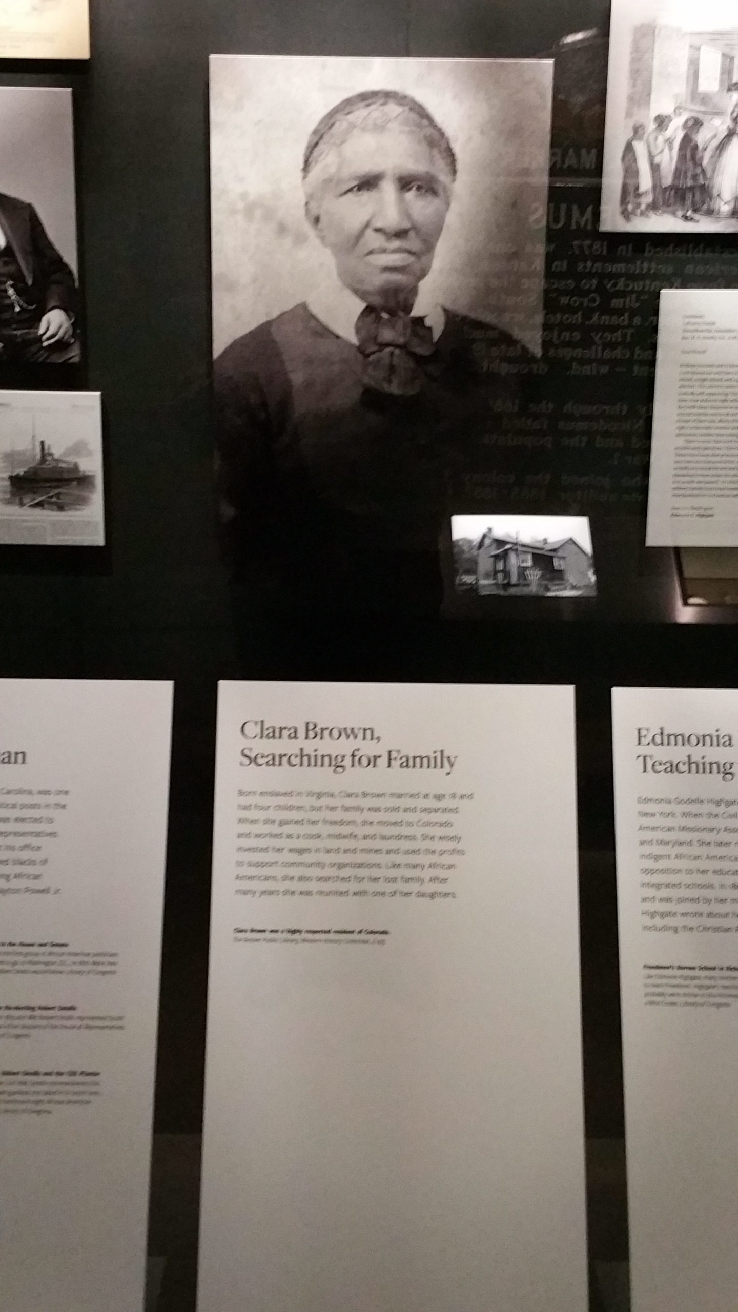 I know that the NMAAHC can’t extensively document EVERYTHING about the black experience in the U.S., but I was grateful for the nod to those of us in the western United States. Even notable figures from my home state Colorado’s past got some recognition. Most notably, Clara Brown, a formerly enslaved African American woman, who was a successful entrepreneur and philanthropist in Gold Rush-era Colorado.