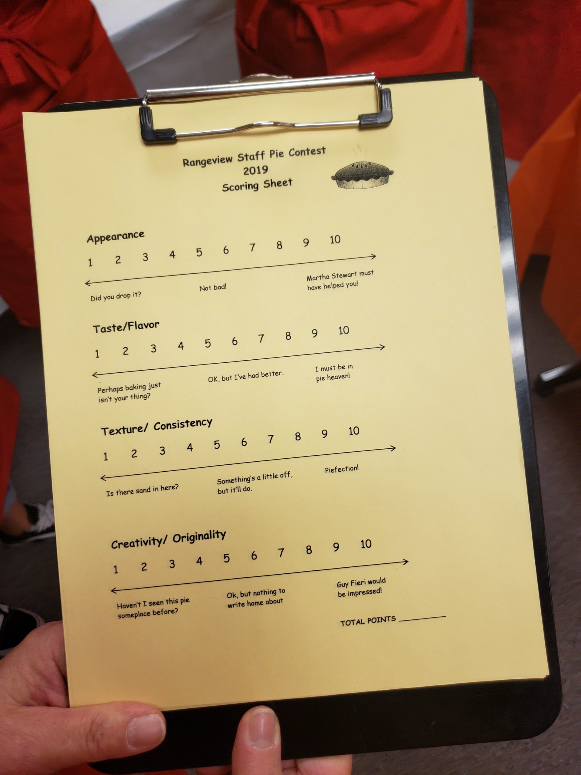 Anne Maslanik helps boost morale amongst the faculty at Rangeview High School in Aurora, Colorado. A few weeks ago, she asked me if I’d come judge a faculty pie contest. I’m not one to turn down FREE pie, so I of course said “Yes!”